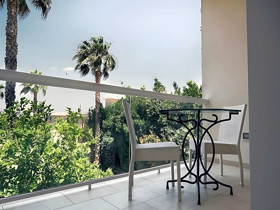 Second-floor junior suite with elegant furniture and a large spa bath. Doors have a digital opening system. It has air conditioning, a TV and private bathroom. Wi-Fi is free. Also features a window facing the shared garden.